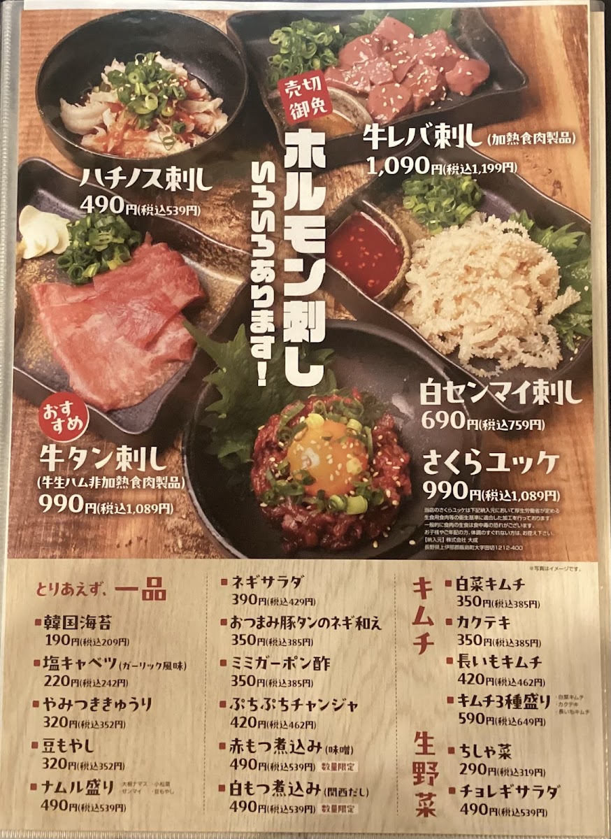 From a reviewer’s perspective, the menu at Rokkodosakaba Jonetsuhorumon, located at 5 Chome-6-20 Kidacho, Nada Ward, Kobe, delivers a focused yet deeply satisfying snapshot of a true Japanese horumon izakaya experience. Rather than overwhelming diners with endless options, the restaurant highlights quality, freshness, and balance through carefully selected dishes. The standout ホルモン酒場の刺し sets the tone, emphasizing the craftsmanship behind preparing offal-style dishes with confidence and respect for ingredients. The 白センマイ刺し offers a clean, lightly chewy texture that feels refreshing and delicate, while the generous ホルモン8種盛り showcases variety and depth, allowing diners to explore multiple cuts in one cohesive platter. For those who prefer leaner flavors, the 赤身6種盛り provides a satisfying contrast, focusing on meat-forward richness without heaviness. The inclusion of キムチ3種盛り adds brightness and spice, effectively cutting through the richness of the meats and enhancing the overall rhythm of the meal. To complete the experience, a glass of 日本酒(S) ties everything together, reinforcing the izakaya atmosphere and complementing both raw and seasoned dishes. Taken as a whole, the menu reflects confidence in simplicity-each item feels intentional, well-matched, and true to the restaurant’s identity. As a conclusion to the dining experience, Rokkodosakaba Jonetsuhorumon’s menu leaves a lasting impression of authenticity, balance, and quiet passion, making it a memorable stop for anyone seeking a genuine taste of Kobe’s local food culture.